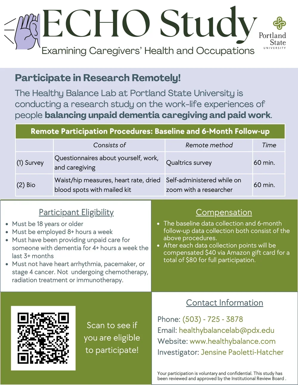 The ECHO study is led The Healthy Balance Lab at Portland State University is conducting a fully remote research study on the work-life balance of dementia caregivers. This study explores how both paid employment and unpaid caregiving impact stress levels—psychologically and physically.
