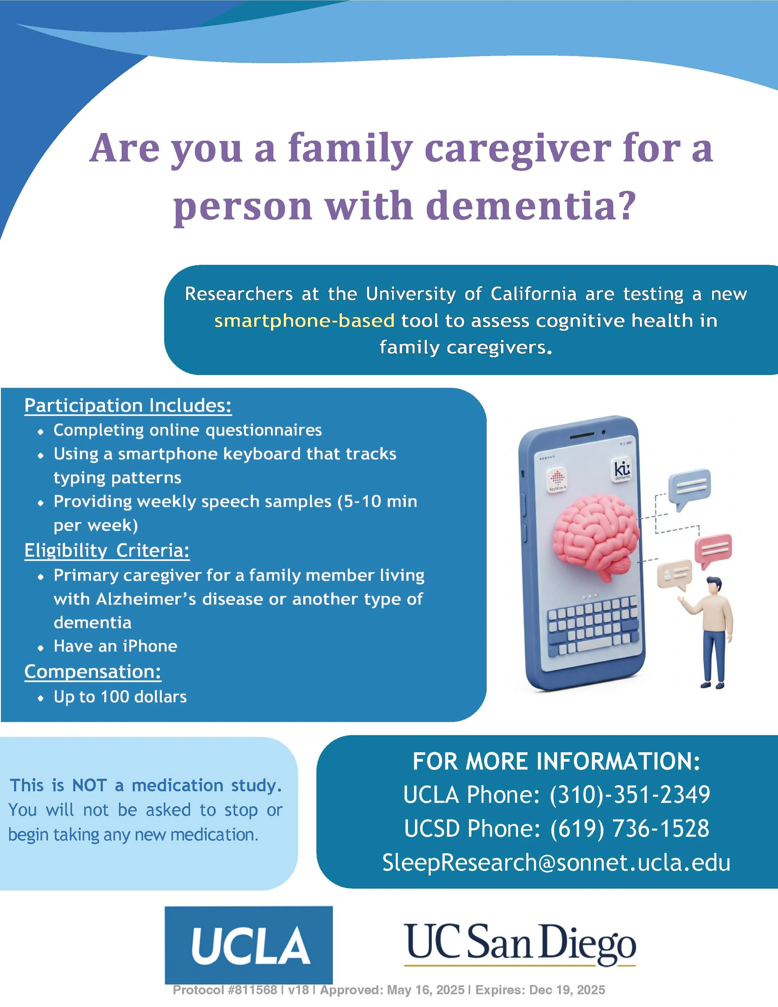 UC San Diego (UCSD) and UC Los Angeles (UCLA) are collaborating on a new research study that is aimed to use smartphones to detect risk for developing a disease of the brain later in life (such as Alzheimer’s disease or dementia) in family caregivers.